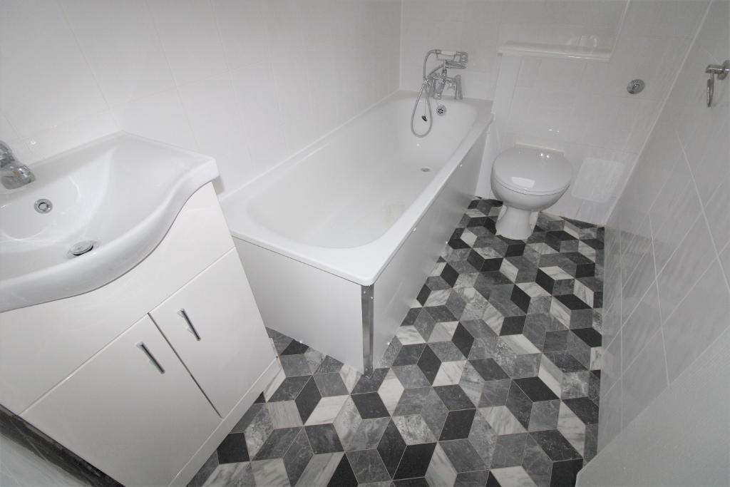 8' 2'' x 4' 7'' (2.5m x 1.4m) Vinyl flooring, extractor fan and a radiator. Three-piece bathroom suite to include a panel enclosed bath, pedestal hand basin, low level W.C. and part tiled walls and splashbacks. Frosted double glazed window.