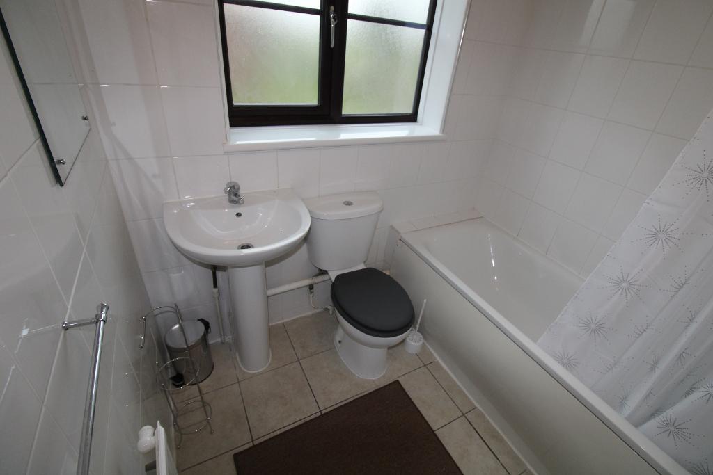 6' 6'' x 5' 10'' (2m x 1.8m) Ceramic tiled floor and radiator. Three-piece bathroom suite to include a panel enclosed bath with shower mixer taps, pedestal hand basin, low level W.C. and part tiled walls and splashbacks. Frosted double glazed window.