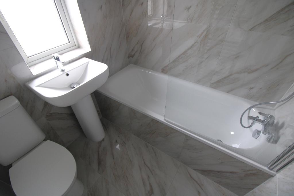 Tiled flooring and radiator. Three-piece bathroom suite to include a panel enclosed bath, pedestal hand basin, low level W.C. and part tiled walls and splashbacks. Frosted double glazed window
