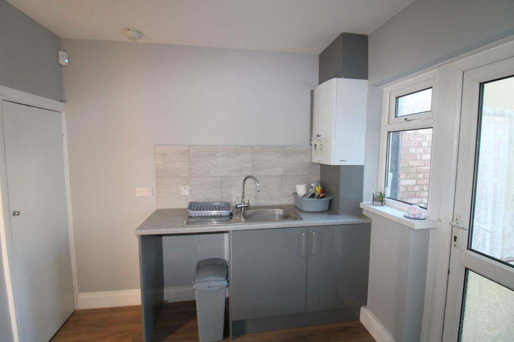 Laminate flooring. Fitted wall and base units with worktops to include a single drainer sink unit, gas hob, extractor fan hood, electric oven, plumbing for washing machine and part tiled walls and splashbacks. Double glazed window to the rear aspect door leading to the extension.