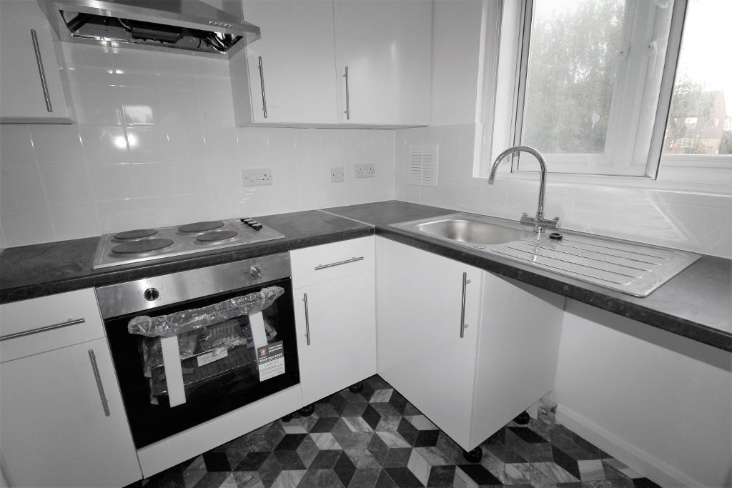 8' 2'' x 6' 4'' (2.5m x 1.95m) Vinyl flooring. Fitted wall and base units with worktops to include a single drainer sink unit, electric hob, extractor fan electric oven, fridge, washing machine and part tiled walls and splashbacks. Double glazed window to side aspect