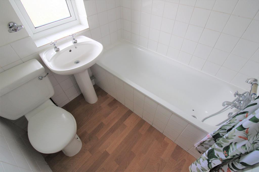 Tiled flooring and radiator. Three-piece bathroom suite to include a panel enclosed bath, pedestal hand basin, low level W.C. and part tiled walls and splashbacks. Frosted double glazed window