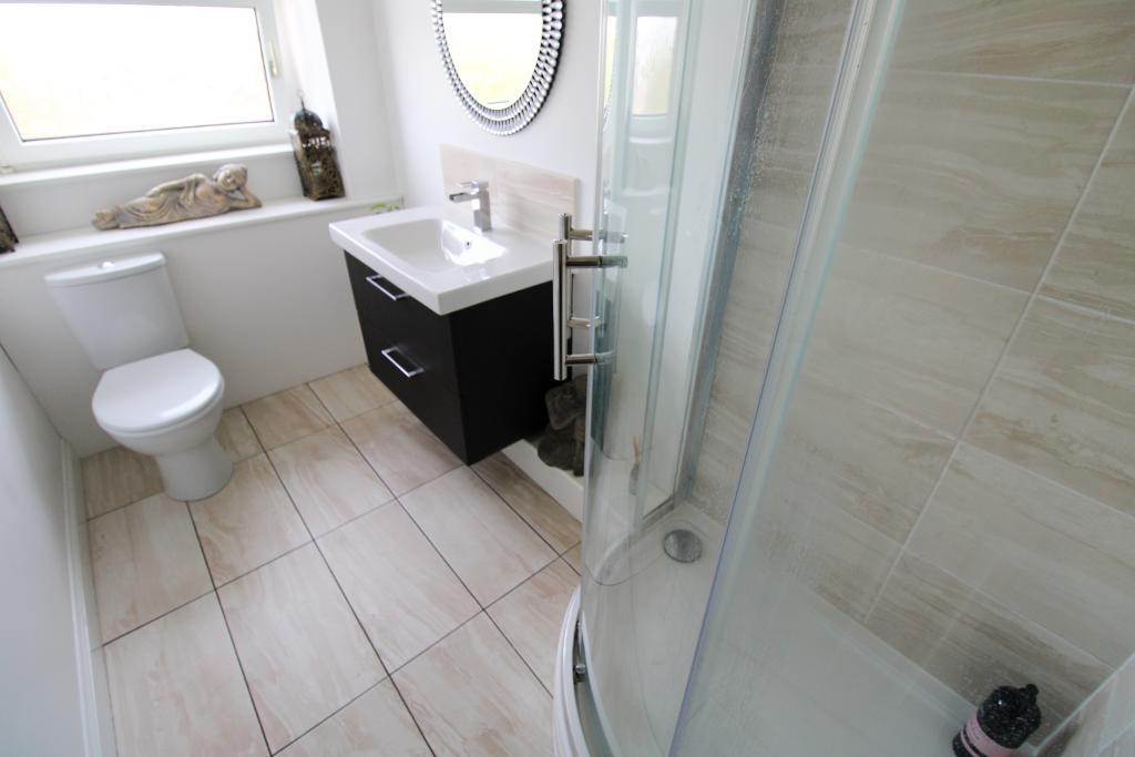 10' 5'' x 4' 11'' (3.2m x 1.5m) Tiled flooring Three-piece bathroom suite to include electric shower, hand basin on storage unit, low level W.C. and Frosted double glazed window.