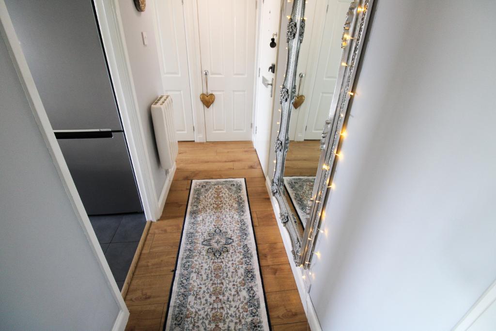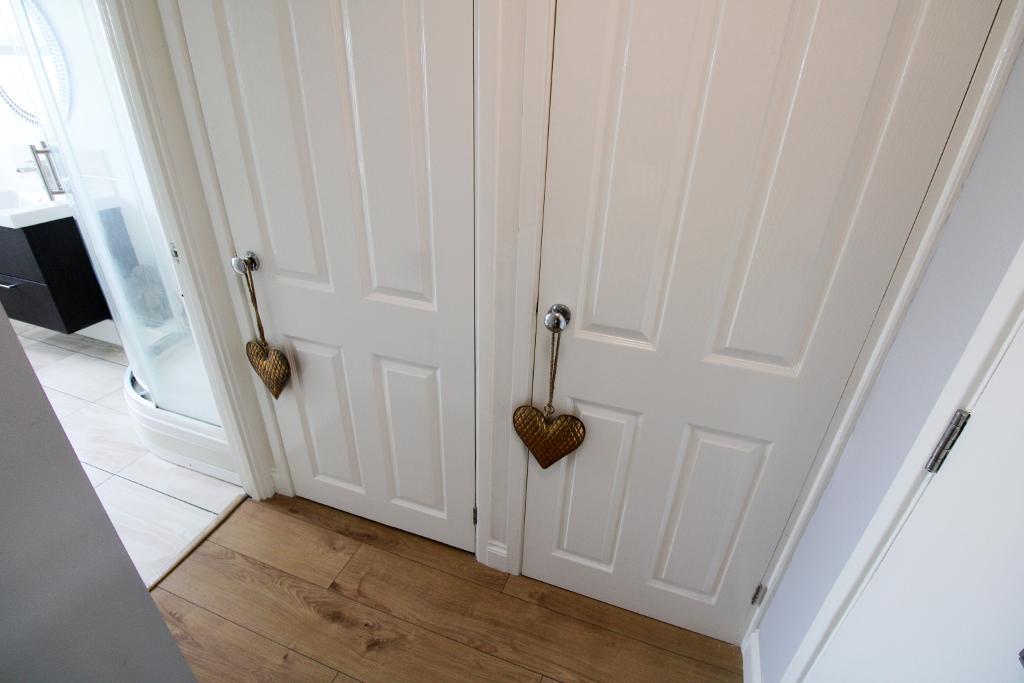 Wood laminate flooring, entryphone handset and built in cupboard.